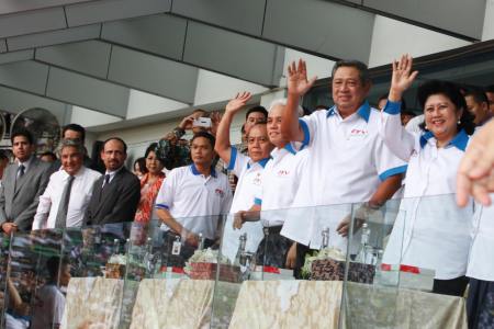 Peresiden RI Bapak Dr. H. Susilo Bambang Yudhoyono didampingi ibu negara Hj. Ani Yudhoyono serta Menteri Koperasi dan UKM Syarief Hasan dan Menteri Perekonomian Hatta Rajasa, melambaikan tangan kepada wirausahawan pemula pada acara Gerakan Kewirausahaan Nasional (GKN) ke -3 di Gelora Bung Karno Jakarta, Senin (18/3). Sekitar 80 ribu massa hadir memadati Gelora Bung Karno. DEDE ZAKI MUBAROK/RMOL