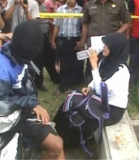 Ag (16), warga Banjar Kolot, Kota Banjar hanya bisa tertunduk lemas dan malu ketika petugas memintanya untuk mereka ulang adegan pembunuhan terhadap Popy (16), pacar pelaku sendiri, tadi siang.