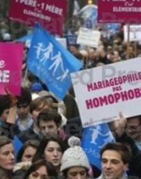 Dengan melambalikan bendera berwarna pink dan biru, para demonstran meneriakkan, "Kami tidak setuju dengan undang-undang Anda, Hollande!"