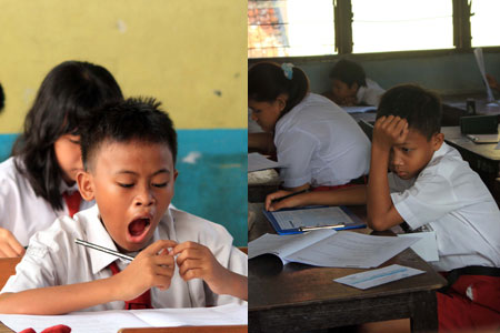 Murid-murid SD di Ciputat Tangerang Selatan terlihat mengantuk (foto kiri) dan berpikir (foto kanan) saat mengerjakan soal-soal Ujian Nasional hari pertama, (Senin (6/5). M IQBAL ICHSAN/RM
