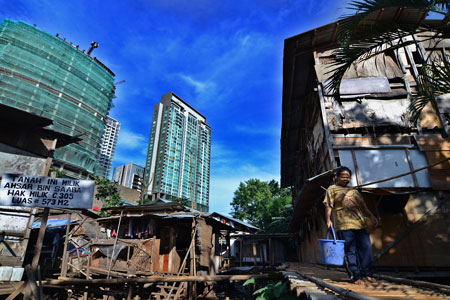 Seorang warga membawa ember untuk mengambil air di pemukiman sementara yang tampak kumuh di kawasan Cipete, Jakarta Selatan, (Rabu 15/5). Di ibukota Jakarta, masih banyak terdapat pemukiman kumuh. PATRARIZKI SYAHPUTRA/RM