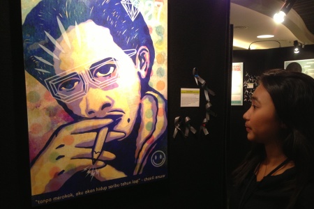 Della (21), seorang mahasiswa di Jakarta, memperhatikan lukisan sosok sastrawan besar Indonesia Chairil Anwar yang menggigit sebatang pinsil sebagai ganti rokok dalam foto asli yang beredar luas. Lukisan karya Galih Pratama ini adalah satu dari belasan lukisan bertema "Quit for Better Life" yang dipamerkan di Alun-alun Indonesia di Grand Indonesia, Jakarta (29/5). Pada bagian bawah lukisan tertulis kalimat: "Tanpa merokok, aku akan hidup seribu tahun lagi." Kalimat ini adalah parodi dari salah satu kalimat dalam puisi "Aku" karya penyair kelahiran Medan, 26 Juli 1922 itu. Chairil Anwar meninggal dalam usia muda pada 28 April 1949 karena kanker paru-paru. TEGUH SANTOSA/ RMOL