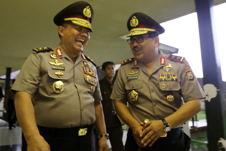 Kapolda Sulselbar, Irjen Pol Burhanuddin Andi (kiri) berjalan bersama mantan Kapolda Sulselbar, Irjen Pol Mudji Waluyo dalam sebuah acara di kantor Sekolah Polisi Negara (SPN) Batua, Makassar, Sulsel, Kamis (13/6/2013). Kapolda Sulsel, Irjen Pol Burhanuddin Andi mengumpulkan semua Kapolres se Sulawesi Selatan kemarin. MUHAMMAD IDHAM AMA/FAJAR/JPNN