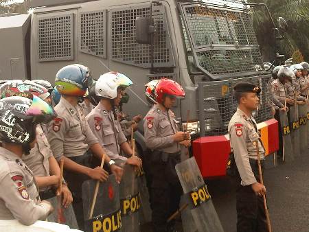 Aparat kepolisian di areal MPR/DPR/DPD RI, Senayan, Jakarta (Senin, 17/6), menggunakan helm standar yang biasa dipakai untuk berkendara motor saat menjaga sidang paripurna RUU APBN-P 2013 dari kepungan ribuan orang demonstran anti kenaikan harga BBM. Entah mengapa mereka menggunakan helm standar motor, bukannya helm PHH (pasukan huru-hara) yang biasa dipakai aparat Polri untuk mengendalikan rusuh massa. HENDRY GINTING/RMOL