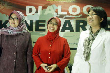 Pengamat Politik LIPI Siti Zuhro (kanan) bersama ekonom Econit Hendri Saparini (kiri) anggota DPD Intsiawati (tengah) disela-sela Dilog Kenegaraan, Rabu (19 Juni 2013) di Gedung parlemen di Jakarta. Dialog tersebut membahas soal kesiapan diberbagai daerah atas imbas kenaikan BBM. MUSTAFA RAMLI/ JAWA POS