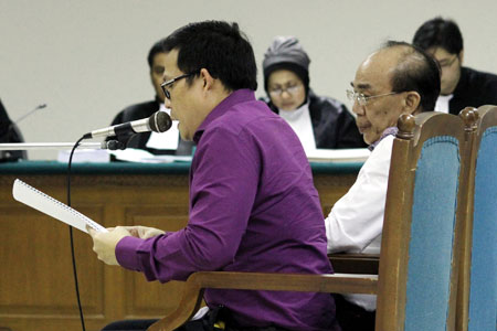Terdakwa dugaan korupsi suap pengurusan kuota impor sapi, Direktur PT Indoguna Utama, Aria Abdi Effendi (kiri) dan Juard Effendi (kanan) saat dihadirkan dalam sidang di Pengadilan Tindak Pidana Korupsi Jakarta, Rabu (19/6). Sidang tersebut mengagendakan pembacaan pleidoi (nota pembelaan). M IQBAL ICHSAN/RM