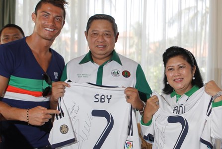 Presiden Susilo Bambang Yudhoyono dan Ibu Ani bersama Cristiano Ronaldo (CR7) usai acara `Save the Mangrove, Save the Earth`, di Nusa Dua, Bali, Rabu (26/6). SBY dan Ibu Ani menerima kaos klub Real Madrid dengan nomor punggung 7 milik Ronaldo. PRESIDENRI.GO.ID