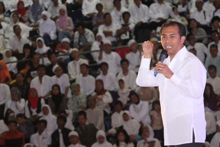 Anggota DPR dari PDI Perjuangan yang juga top leader Melia Sehat Sejahtera (MSS) Syukur Nababan menyampaikan sambutan pada acara buka puasa bersama ribuan anggota MSS di Istora Senayan, Jakarta Jumat (13/7). Acara buka puasa yang ini rutin digelar tiap tahun. Tahun ini puasa bersama akan digelar di 12 kota besar lainnya di Indonesia. MSS/RMOL