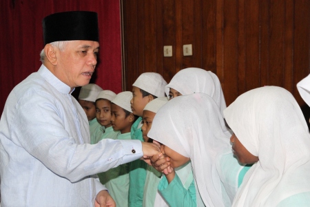 Menko Perekonomian Hatta Rajasa menyalami anak yatim pada acara puasa bersama di Graha Sawala, di Komplek Gedung