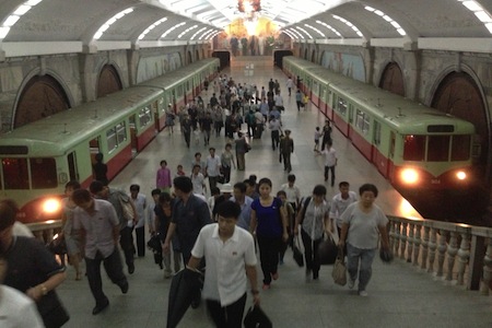 Suasana di peron kereta bawah tanah (subway) di Stasiun Puhung, di Pyongyang, ibu kota Korea Utara. Berada di kedalaman lebih dari 100 meter dari permukaan tanah, lintasan alat transportasi massal yang diberi nama Pyongyang Metro ini mulai dibangun pada 1965 dan selesai pada 1975. Foto di atas diambil dalam kunjungan ke Pyongyang di pekan ketiga Juli 2013 yang lalu dalam rangka memantau peringatan ke-60 tahun akhir Perang Korea. Suasana di dalam peron ini tidak jauh berbeda dibandingkan dengan 10 tahun yang lalu. Satu-satunya perbedaan mencolok yang terasa adalah jumlah penumpang yang kini relatif lebih banyak. TEGUH SANTOSA/RMOL