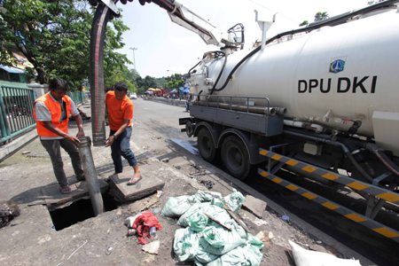 Petugas di bantu mobil penyedot limbah cair milik Unit Pelaksana Teknis Alat-alat dan Perbekalan (Alkal) Dinas Pekerjaan Umum DKI Jakarta dioperasikan untuk membersihkan saluran air di Kawasan Tanah Abang, Jakarta, Sabtu (10/8). Penyedotan ini berlangsung sejak malam takbir hingga hari ini, DPU Alkal sudah menyedot lebih dari 53 kubik air comberan untuk mengantisipasi genangan air yang kerap terjadi saat turun hujan. RANDY TRI KURNIAWAN/RM