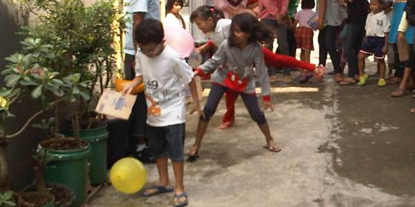 (18/8). Tampak tiga anak tengah mengipas balon menuju ke garis finish.HENDRY GINTING/RMOL