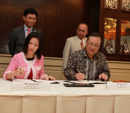 Menteri Koperasi dan UKM Syarief Hasan bersama Menteri Perdagangan dan Industri Singapura Lee Yi Shyan menyaksikan penandatanganan kerjasama di bidang pendidikan untuk anak-anak difable dan anak-anak yang berkebutuhan khusus, di Nusa Dua Bali, Rabu (6/9). HUMAS KEMENKOP