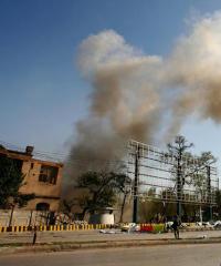 Ledakan keras yang diikuti suara tembakan terdengar dan kepulan asap tebal terlihat mengepul keatas kota di barat Afghanistan itu.