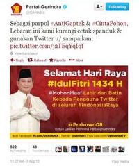 Selain itu, dia menjelaskan, perkembangan teknologi informasi semakin pesat membuat manusia dapat semakin mudah berinteraksi dengan manusia lainnya. Penggunaan media sosial seperti Twitter adalah bagian dari kampanye kreatif yang dilakukan oleh Gerindra.