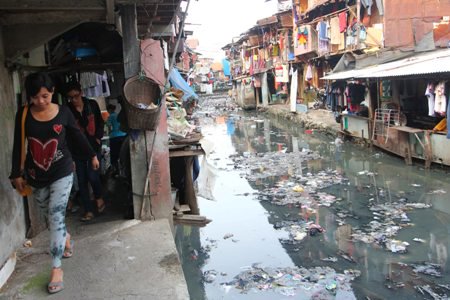 Aktifitas warga di pemukiman kumuh, di pinggir Kali Krukut, Tanah Abang, Jakarta Pusat, Sabtu (21/9). Pemerintah DKI Jakarta berencana melakukan penataan pemukiman di bantaran kali ini, selain untuk mengurangi potensi banjir penataan ini juga untuk perbaikan sanitasi dan lingkungan warga agar lebih layak dan sehat. TEDY KROEN/RAKYAT MERDEKA
