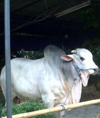 Tadi pagi pukul 10.15, sapi putih tersebut diangkut dengan truk dan langsung ditempatkan di bawah tenda biru, tepat di halaman masjid.