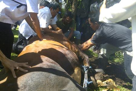 Seperti tahun-tahun sebelumnya, Gubernur Jawa Barat Ahmmad Heryawan menyembelih sendiri hewan kurbannya. Idul Adha 1434 H kali ini, Aher panggilan akrabnya menyembelih delapan ekor kambing dan satu ekor sapi. Ditemani istri, Aher menyembelih kesembilan ekor hewan kurban itu di belakang rumah dinas di Gedung Pakuan Bandung, Selasa (15/10). ARIEF PRATAMA/RMOL