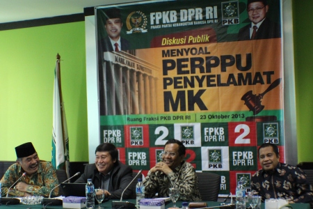 Anggota Komisi III Fraksi PKB Otong Abdurrahman; Komisioner Komisi Yudisial Taufiqurrahman Syahuri; bekas Ketua Mahkamah Konstitusi Mahfud MD dan Ketua Fraksi PKB Marwan Jafar (kiri ke kanan) menjadi pembicara dalam diskusi publik soal Perppu MK yang diselenggarakan Fraksi PKB di gedung DPR RI, Senayan, Jakarta kemarin, Rabu, (23/10).