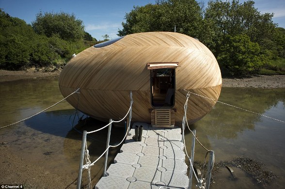 Sebuah rumah telur yang terbuat dari kayu mengapung di air di sungai Beaulieu Inggris. Rumah telur tersebut akan digunakan sebagai lokasi pengambilan gambar tempat tinggal dan ruang berkarya oleh artis berusia 58 tahun, Stephen Turner, selama satu tahun sebagai bagian dari seri kedua dokumenter George Clarke's Amazing Spaces yang akan mulai ditayangkan di Channel 4 pada Kamis mendatang di Inggris. [DAILYMAIL]