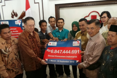 Direktur Utama PT Indomarco Prismatama, Sinarman Jonathan, menyerahkan donasi secara simbolis kepada Ketua Umum Palang Merah Indonesia, Jusuf Kalla di markas PMI, Jakarta (Senin, 18/11). Bantuan yang berasal dari konsumen Indomaret sebesar Rp 6,8 miliar itu akan disalurkan PMI untuk korban topan Haiyan di Filipina. [TIM PMI]
