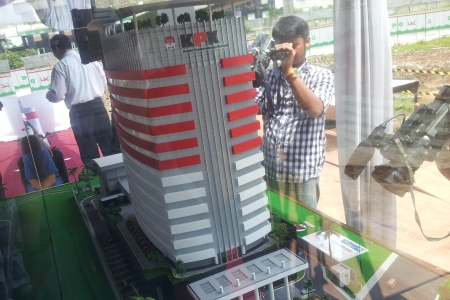 Seorang juru kamera sedang mengambil gambar maket gedung baru KPK di sela-sela acara peletakan baru pertama gedung tersebut di Jalan Gembira, Guntur, Jakarta Selatan, (Senin, 9/12).