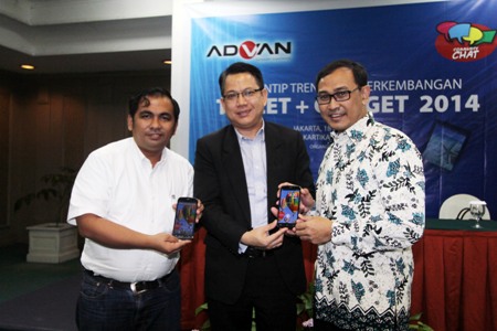 Chief Marketing Officer Advan Candra Lianto (tengah) bersama pengamat telekomunikasi, Teguh Prasetya (kanan) dan Pendiri Komunitas ID Android, Agus Hamonangan menunjukkan ponsel pintar Advan Vandroid S5G yang diluncurkan di Jakarta, Rabu (18/12). Advan Vandroid S5G hadir dengan tiga kesempurnaan Screen yang menggunakan sistem teknologi IPS yang memungkinkan penglihatan dari berbagai arah di bawah terik matahari sekalipun, kemudian kamera resolusi tinggi yakni 18 MP dan penyimpanan data yang besar 32 GB. DWI PAMBUDO/RM