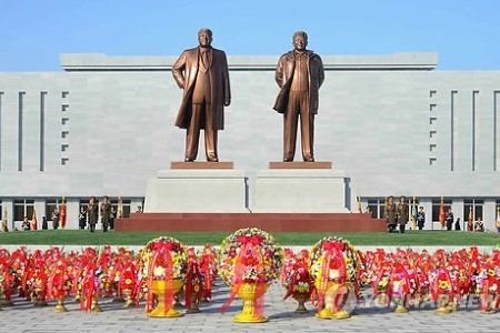 Sebuah foto yang dilansir surat kabar Korea Utara, Rodong Sinmun seperti dikutip media Korea Selatan, Yonhap pada Senin (23/12) menunjukkan patung mantan pemimpin Korea Utara, Kim Il-sung dan anaknya Kim Jong-il yang baru didirikan di kota pantai timur Wonsan, dan diresmikan pada Minggu kemarin (22/12). YONHAP
