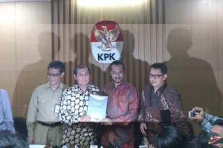 Ketua Badan Pemeriksa Keuangan (BPK) Hadi Poernomo menyerahkan laporan akhir hasil perhitungan (LHP) Bank Century kepada Ketua Komisi Pemberantasan Korupsi (KPK) Abraham Samad di Gedung KPK, Jalan Rasuna Said, Jakarta, Senin (23/12).