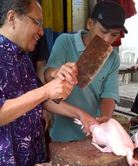Dalam kesempatan tersebut, Rizal bahkan memperagakan memotong ayam potong yang dipandu seorang pedagang. "Jangan terlalu ke atas tangannya Pak," kata seorang pedagang mengingatkan, seraya terdengar pedagang lain memanggil-manggil agar dagangannya juga disambangi.