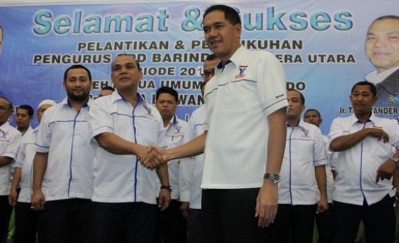 Ketua Umum DPP Barisan Indonesia (BARINDO) Gita Wirjawan bersalaman dengan Ketua BARINDO Sumut, Ir Alexander Fasha, pada acara pelantikan pengurus DPD BARINDO Sumut di Hotel Madani, Medan, Senin siang, (20/10). Dalam kesempatan itu, Alex berkomitmen menjalankan arahan Gita Wirjawan, mengembangkan sayap ormas kemasyarakatan itu hingga ke 33 kabupaten/kota se-Sumut. [BARINDO]