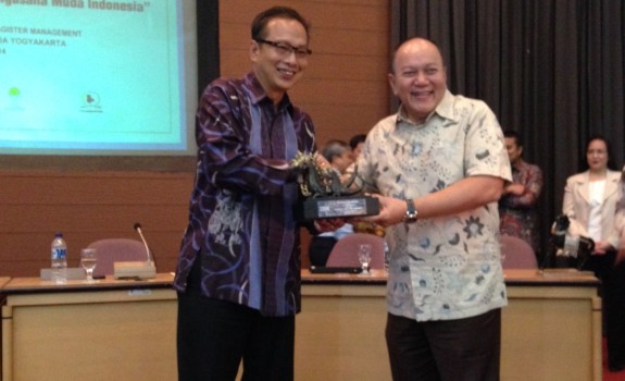 Deputi Sumber Daya Manusia Kementerian Koperasi dan UKM, Prakoso BS, menerima cinderamata pada acara seminar PT. IBM Indonesia dengan tema " Meningkatkan Pertumbuhan Pengusaha Muda Indonesia" di Auditorium UGM, belum lama ini. [HUMAS SDM]
