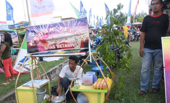Seorang pedagang makanan tampak sibuk memasak kerak telor menggunakan tungku kecil. Penganan khas Betawi ini turut memeriahkan pasar rakyat dalam kegiatan perayaan Hari Pers Nasional 2014 yang berlangsung di kawasan Sport Center Objek Wisata Pantai Panjang, kota Bengkulu. WIDYA VICTORIA/RMOL