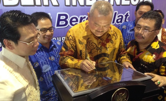 Gubernur Sumatera Selatan Alex Noerdin menandatangani plakat pendirian sekolah jurnalistik ASEAN di arena Hari Pers Nasional (HPN) 2014 di Bengkulu (Minggu, 9/2). Penandatanganan disaksikan Presiden Confederation of ASEAN Jornalists Benny Antiporda (paling kiri), Sekretaris Tetap CAJ Akhmad Kusaeni (kedua dari kanan) dan Direktur CAJ Big Solon Sihombing (paling kanan). Palembang akan menjadi tuan rumah pelatihan jurnalistik ASEAN 10-12 Februari 2014. TEGUH SANTOSA/RMOL