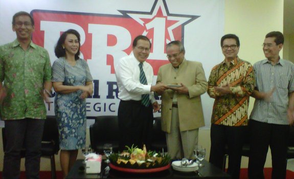 Mantan Menko Perekonomian, DR. Rizal Ramli (baju putih) memberikan nasi tumpeng kepada Leonard Simorangkir SH pada acara peresmian Rizal Ramli Strategic Centre (RRSC), di Jakarta, Kamis (13/2). Leonard Simorangkir merupakan pengacara Rizal Ramli dalam menghadapi somasi yang dilayangkan pengacara keluarga Presiden SBY.
