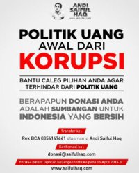 Karena itu, di berbagai stickernya, dia mencantumkam ajakan dan peringatan: "Politik uang awal dari korupsi. Bantu caleg pilihan Anda terhindar dari politik. Berapa pun donasi Anda adalah sumbangan untuk Indonesia yang bersih." Disitu lengkap dicantumkan nomor rekening.