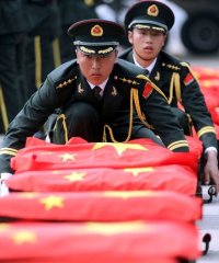 China Daily, Duta Besar China Qiu Guohong, menyematkan bendera China di atas peti mati para tentaranya, sebelum diterbangkan ke China.