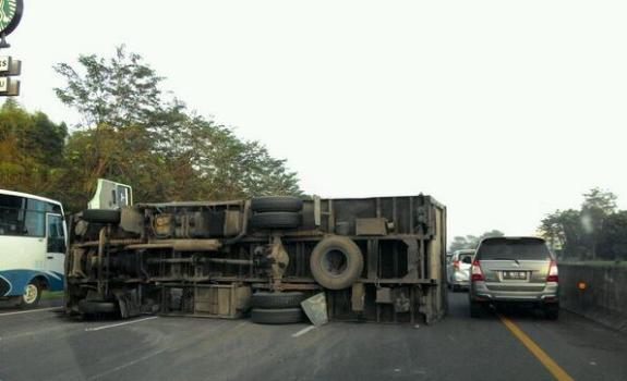 Truk Wingbox dengan nomor polisi L 8030 NQ bermuatan sosis terguling di KM 63 Tol Cikampek menuju Jakarta (Senin, 31/3). Imbas penanganan kecelakaan Truk ini, lalu lintas menuju Jakarta padat merayap. TWITTER @TMCPoldaMetro
