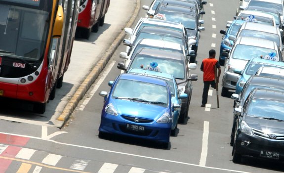 Seorang pengemis meminta-minta kepada pengendara di perempatan Jalan Thamrin, Sarinah, Jakarta, Selasa (1/4). Pemerintah Provinsi (Pemprov) DKI Jakarta yang mengatakan akan menegakkan Perda No 8/2007 tentang Ketertiban Umum, salah satunya membersihkan Jakarta dari pengemis selambat-lambatnya 2014 mendatang, dinilai banyak kalangan sebagai reaksi sesaat pasca tertangkapnya pengemis yang berpenghasilan Rp 25 juta dalam 15 hari. Buktinya, masih menjamur pengemis di berbagai lokasi bahkan di ruas utama Ibukota. TEDY KROEN/RM