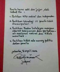 Di dalam pesan yang ditulis tangan dan ditandatangani dengan tinta hitam itu, sang Gubernur DKI Jakarta mengatakan ada empat hal yang bisa membuat proses pemilu berlangsung adil dan jujur.