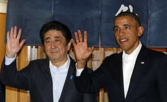 Perdana Menteri Jepang Shinzo Abe (kiri) melambaikan tangan kepada wartawan bersama dengan Presiden Amerika Serikat Barack Obama setelah makan malam di restoran Sukiyabashi Jiro, Tokyo, Jepang (Rabu, 23/4). Kedatangan Obama ke Jepang adalah untuk meyakinkan sekutu mengenai peran AS di kawasan Asia. REUTERS