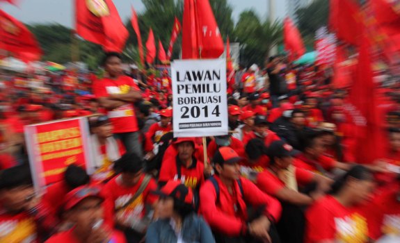 Ribuan Buruh dari berbagai elemen berunjuk rasa di depan Istana Negara Jakarta pada Peringangatan Hari Buruh Sedunia (May Day) (Kamis, 1/5). Selain menyerukan tuntutan kenaikan upah, tolak outsourching, tolak iuran BPJS dan meminta jaminan kesejahteraan, mereka juga menolak Pemilu 2014 karena belum adanya perubahan signifikan baik caleg dan capresnya dan hanya menjadi ajang bagi-bagi kekuasaaan kelompok Borjuasi dan Kapitalis. TEDY KROEN/RM