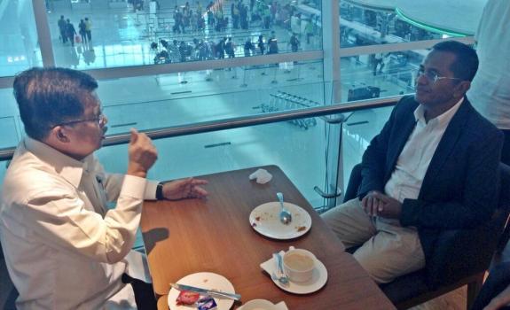 Calon Wakil Presiden Jusuf Kalla (kiri) berbincang dengan Menteri BUMN Dahlan Iskan saat transit di Bandara Sepinggan, Balikpapan sambil menunggu penerbangan lanjutan ke Samarinda, Sabtu (24/5). Dalam pertemuan singkat itu, Dahlan menegaskan akan mendukung pasangan Joko Widodo-Jusuf Kalla pada Pilpres 2014 ini. [@Pak_JK]