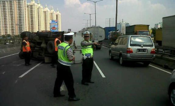 Kecelakaan tunggal truk dengan nomor polisi B 9163 RU di KM 11.8 Tol Cempaka Putih arah Cawang (Senih, 2/6). Saat ini, polisi sedang menangani kecelakaan tersebut. TWITTER @TMCPoldaMetro