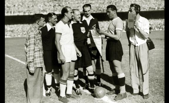 Bersama seorang reporter radio Brazil di dekatnya, kapten tim, August (kiri) dan Obdulio Varela dari Uruguay melakukan pertukaran panji-panji sebelum pertandingan untuk menentukan juara turnamen. Memasuki pertandingan, Brazil hanya membutuhkan seri untuk mengamankan gelar. Uruguay juga menginginkan kemenangan.GETTY IMAGE