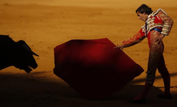 Seorang matador baru bernama Miguel Andrades menunjukkan aksi untuk mebuat banteng melintasi kain merah selama pelatihan kelas master di arena adu banteng di Malagueta, Malaga, Spanyol pada Rabu (2/7). REUTERS
