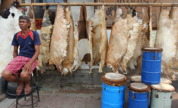 Pengrajin sekaligus penjual tengah memasang selaput kulit bedug, di Pasar Kambing, kawasan Tanah Abang, Jakarta, Sabtu (5/7). Di bulan Ramadhan terutama menjelang perayaan Hari Raya Idul Fitri, pedagang mengaku permintaan Bedug melonjak tidak saja di Jakarta namun dikirim ke luar kota seperti Sumatera dan Kalimantan. Harga satu bedug rata-rata dibanderol mulai dari Rp 150.000 untuk ukuran kecil hingga Rp.1.500.000 ukuran besar. TEDY KROEN/RAKYAT MERDEKA