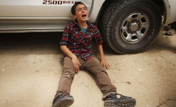 Seorang anak lelaki Palestina menangis ketika ayahnya yang tewas akibat serangan udara Israel dimakamkan di kota Gaza. Serangan udara yang dilancarkan oleh Israel dan kelompok Hamas di Jalur Gaza sejak awal pekan lalu telah menyebabkan lebih dari 120 orang warga Palestina tewas dan ratusan orang lainnya luka-luka. Sebagian besar korban merupakan warga sipil. BBC