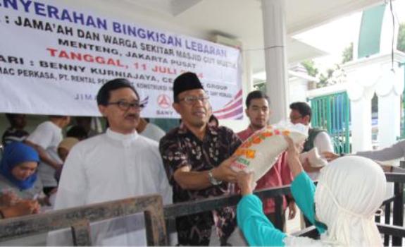 Presiden Direktur PT Jakarta International Machinery Centre (Jimac) Group Benny Kurniajaya yang diwakili Akuan Mansyur selaku Finance Director Jimac Perkasa serta Direktur Operasional Rental Perkasa Budiono didampingi Puji Mulia Presdir PT Konstruksi Indo Machinery, Encep Sumitra, Manajer Operasional PT Sany Perkasa serta Perwakilan Sany Group Idea Xiau, Marketing Manajer untuk Indonesia memberikan sumbangan 15 ton beras yang dibagikan kepada 3.000 fakir miskin, anak yatim dan kaum dhuafa di sekitar Masjid Cut Meutiah Menteng, Jakarta Pusat (Minggu, 13/7). JIMAC
