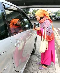 Yang mencolok adalah sekitar 10 orang pengamen waria yang diantaranya menggunakan pakaian wanita muslim atau hijab. Mereka berkerumun tepat di trotoar lampu merah tersebut.